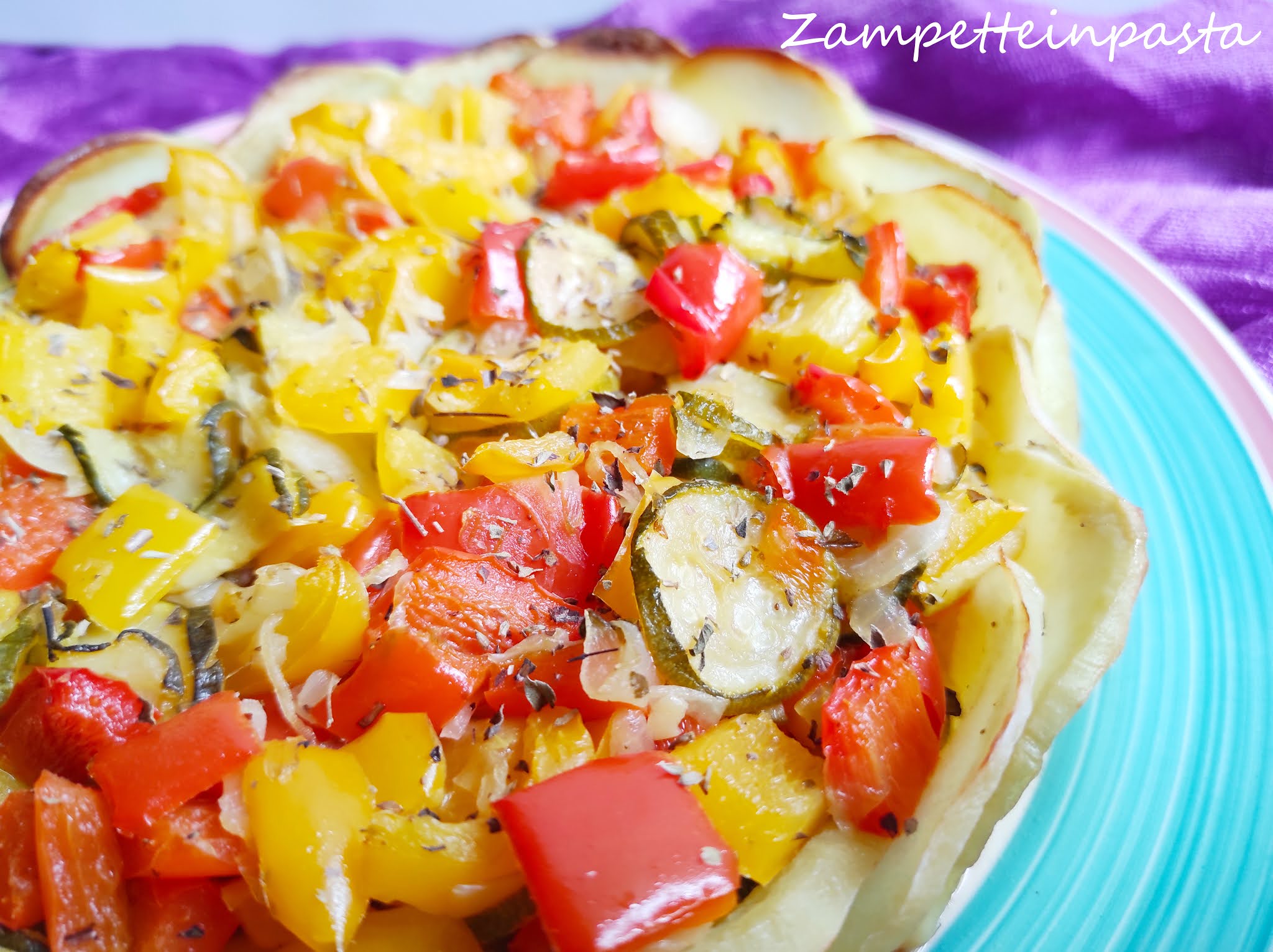 Per la mia quinta portata ho pensato ad una torta salata, ma senza usare pasta sfoglia o brisèe, ho racchiuso le verdure in uno scrigno di fettine di patate per un risultato davvero sorprendente!!!